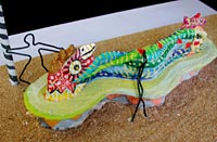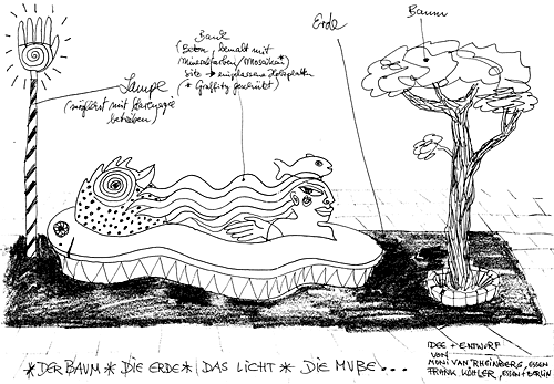14: Sitzen ohne Bezahlung Innenstadt Wir stellen uns vor, an einem wirtschaftlich übergenutzen Raum (Innenstadt) einen Ort zu schaffen, der unkommerziell genutzt wird: Sitzen ohne Bezahlung Der Raum wird anders beschaffen sein als seine Umgebung. D.h. er wird sich von "Grund auf" von dieser abheben durch seine unkonventionellen Formen und Farben. Der Boden sollte festes Erdreich haben. Die Sitzgelgenheit ist von allen Seiten be-sitz-bar. Sie wird von allen Seiten mit einem sich verändernden Motiv ein immer wieder neues Seh-erlebnis sein. Dieser Platz gleicht auf der einen Seite mit seiner Beleuchtung (möglichst Solarenergie) und auf der anderen Seite mit einem Baum, einer Installation und wird Ausdruck finden als "Verweil-Platz", ein Platz zum gucken, zum sich wohl fühlen, ohne Verführung zum Konsumieren.